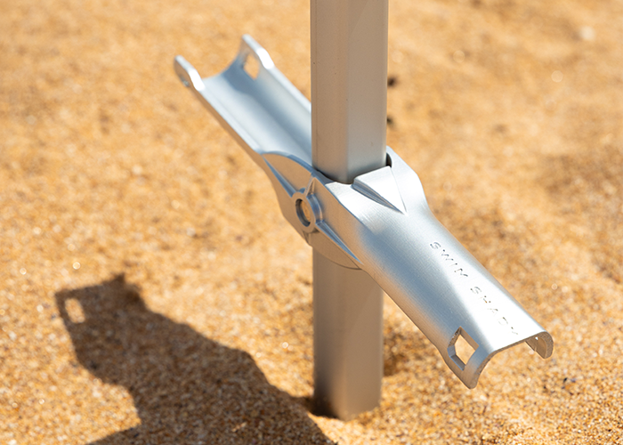The integrated sand screw keeps the Swim Shady firmly held in the sand. Designed for easy set up, the screw handle opens horizontally, allowing the user to rotate the sand screw further into the sand with efficiency and stability. The shade is opened by pressing the button on top of the pole, releasing the hinge to create the desired angle. Engineered with minimal parts for anyone to easily assemble.
